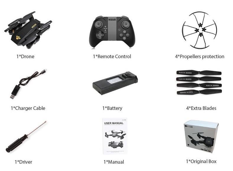VERSÃO GOLD: 1 DRONE + 1 CONTROLE + 4 PROTEÇÃO + CABO CARREGADOR + 1 BATERIA + 4 ELICE EXTRA + 1 CHAVE + 1 MANUAL + CAIXA